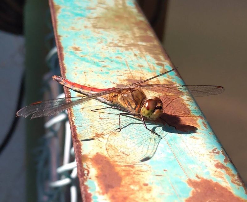 畑のフェンスに赤いトンボが止まりました。美しい翅脈が影となってフェンスに映っています(薄くてわかりづらいのですが)。