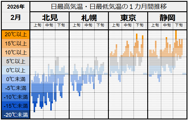 2月の北見と東京の平均気温の差は13.3℃。1月(16.1℃)よりは差が縮まりました。